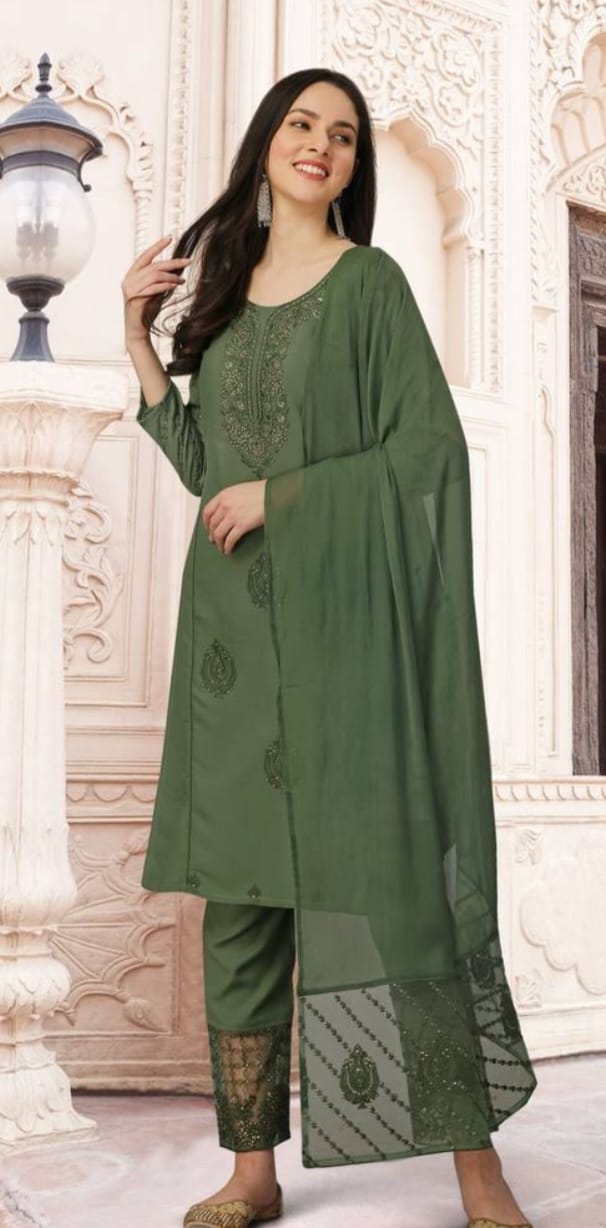 Green cotton rayon embroidered kurta pant with dupatta salwar suit 3 pieces set stitched